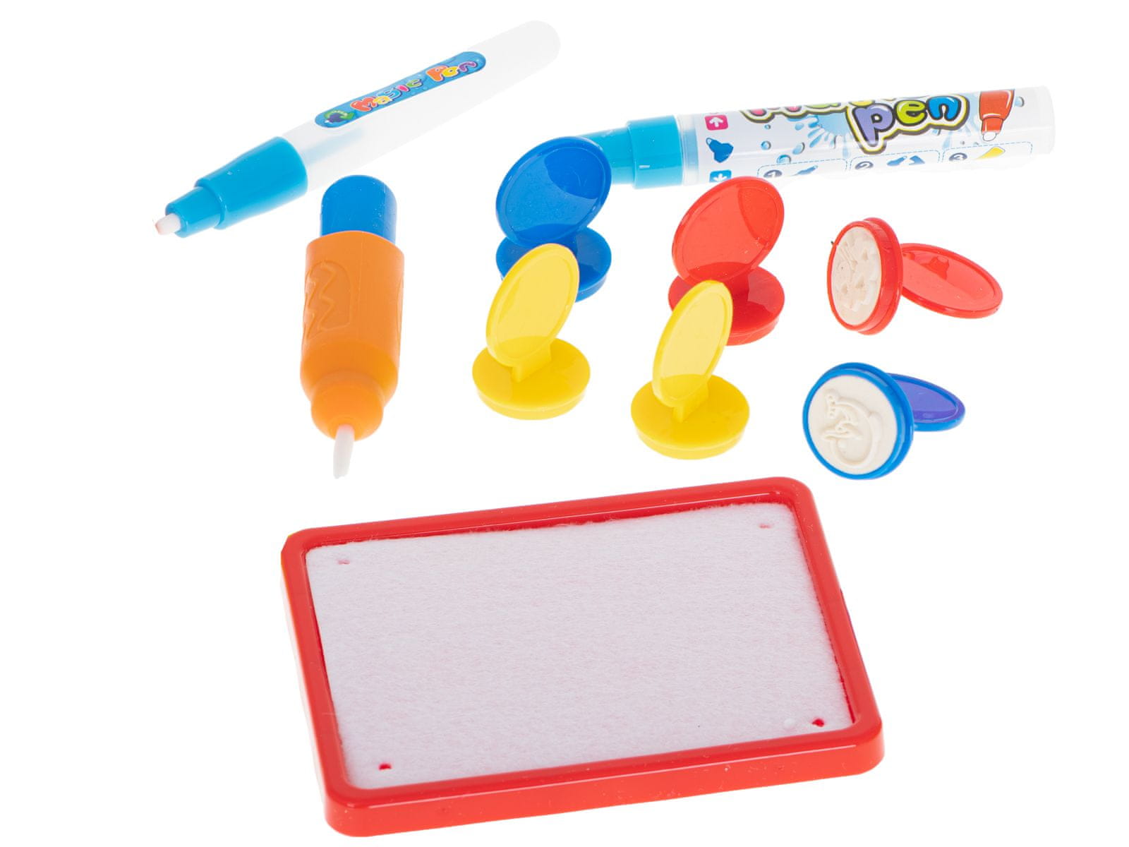 VODNA PODLAGA Z VEČBARVNIMI DODATKI 100×80 cm Ustvarjalno preživljanje prostega časa za vso družino. Ustvarjalna zabava za otroke. Naj vaš otrok postane pravi umetnik. Ni vam treba skrbeti za madeže in umazanijo. Vaš otrok bo slikal samo z vodo. Velika površina podloge pomeni, da bo vaš otrok imel veliko prostora za ustvarjalnost. Za risanje na podlogo ne potrebujete barvic, markerjev ali barv. Vse, kar morate storiti, je, da priloženi označevalnik napolnite z vodo. Ko jo zmočite z vodo, se na podlogi pokaže barvita slika. S priloženimi šablonami lahko na površino narišete različne oblike. Poleg tega obstajajo žigi, ki jih je mogoče po namakanju v vodi odtisniti na površino. Z risbami lahko otrok pokaže vse, česar ni mogoče izraziti z besedami. Pri risanju uporablja roke in možgane za usklajevanje vseh gibov rok, od česar je odvisna natančnost dela. Z vadbo risanja treniramo možgane. Komplet spodbuja domišljijo in ustvarjalnost ter dodatno podpira razvoj umetniških spretnosti in ročne spretnosti. Z otrokom lahko tudi rišete ali barvate, saj je skupno preživljanje časa bistveno za pravilen razvoj. Živahne barve bodo vsakega malčka spodbudile k igri. Vsebina kompleta: podloga 7× žigi 2× markerji 1× čopič 4× šablone za obrisovanje Dimenzije podloge: 100 cm x 80 cm Dimenzije paketa: 40 cm x 29 cm x 5 cm