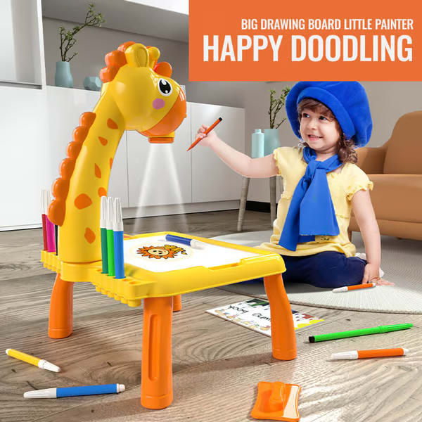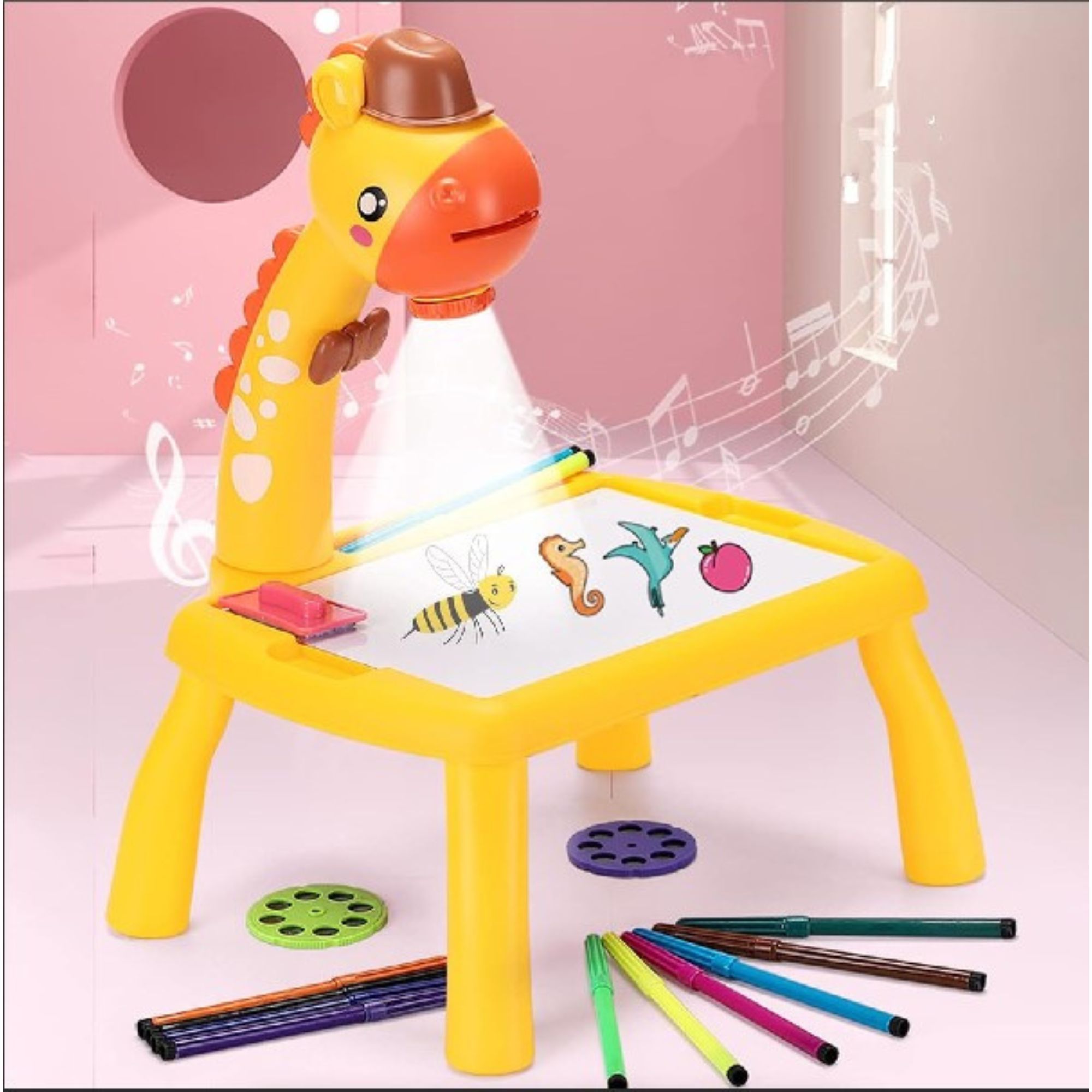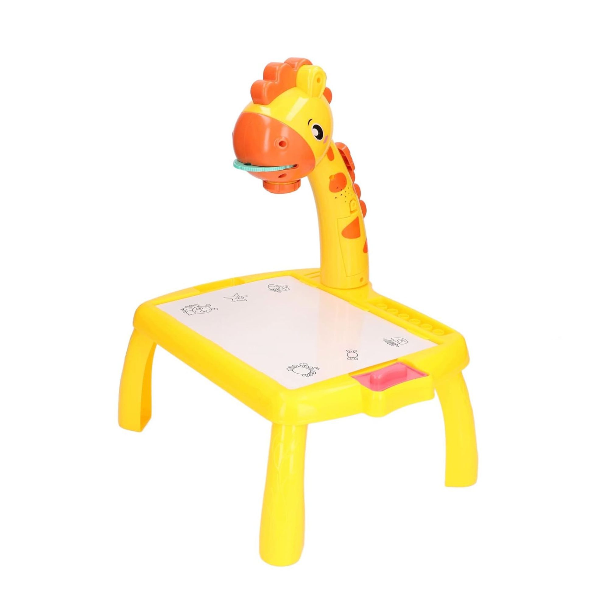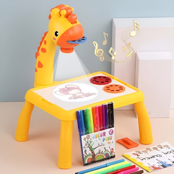 Barvit projektor z motivom žirafe, zasnovan tako, da pritegne pozornost otrok in spodbuja njihov motorični ter kognitivni razvoj.