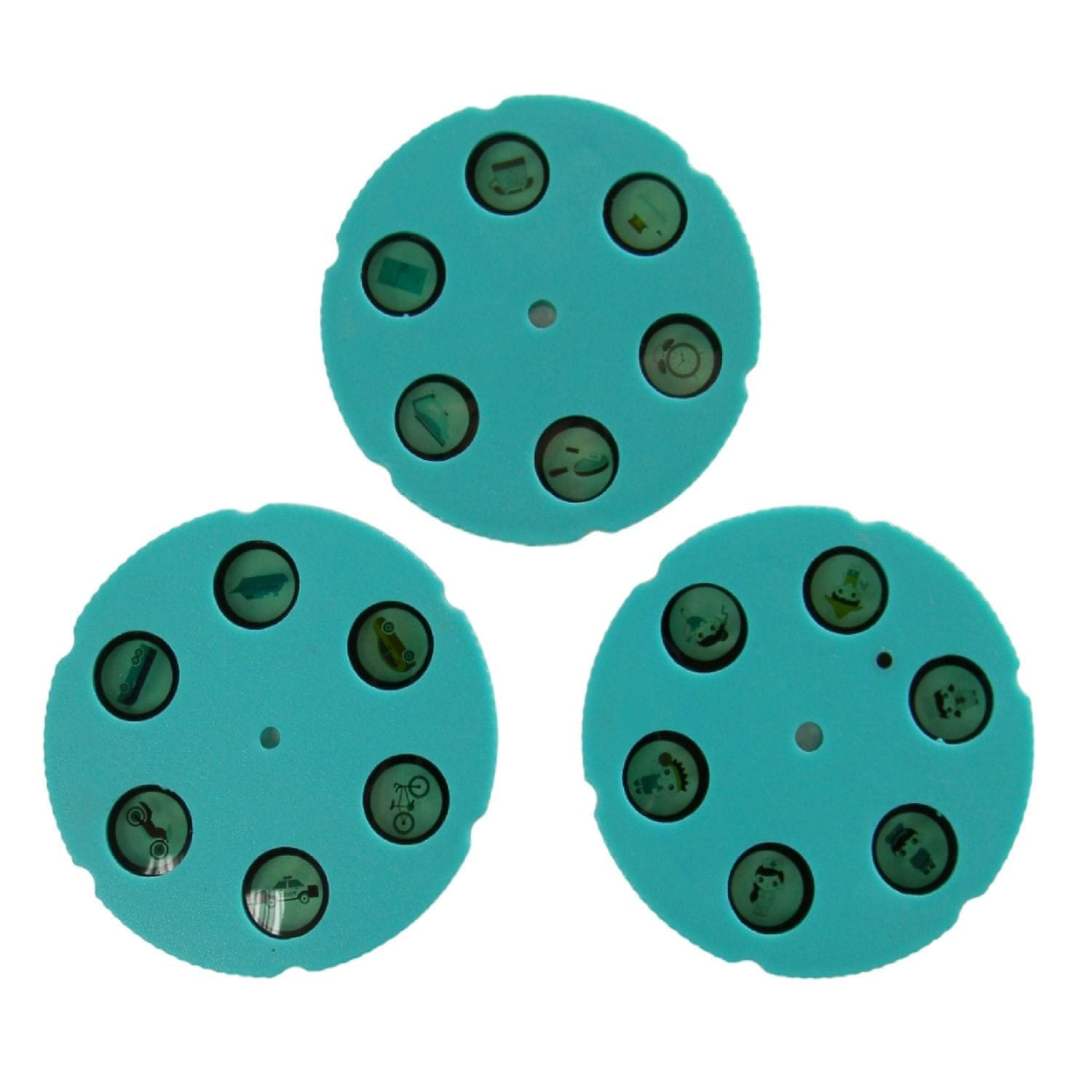 - Projektor ima 3 diske s tematskimi vzorci, zahvaljujoč katerim se otrok uči oblik, barv in imen poklicev, vozil in gospodinjskih aparatov.