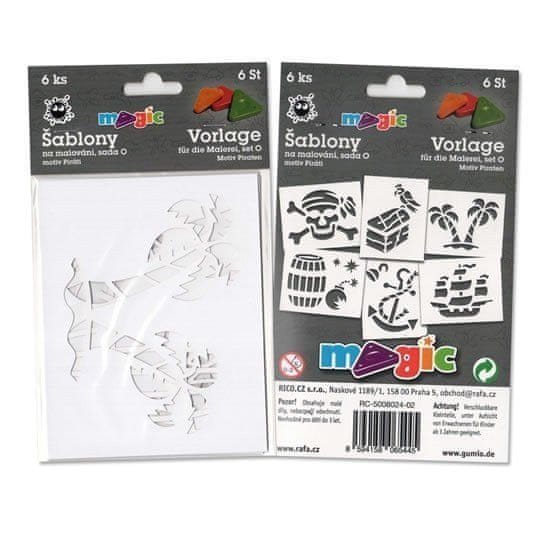 Komplet 6 kosov papirnatih šablon za slikanje. Material beli karton 220 g. Priporočamo za slikanje s čarobnimi voščenimi markerji (tehnika frottage), primerno tudi za slikanje s temperami, za slikanje z markerji za pihanje ali za slikanje s plastelinom. Dimenzije 11×14 cm.
