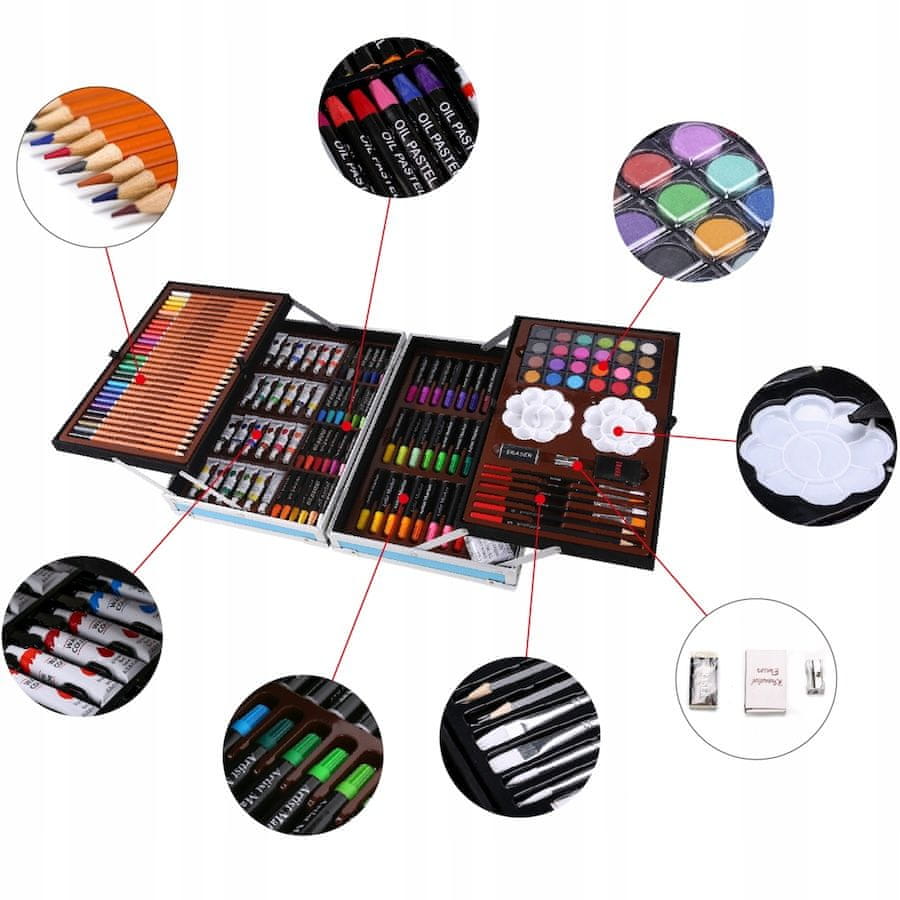 Praktična torbica je izdelana iz aluminija, kar zagotavlja enostavno prenašanje in shranjevanje. Kovček ima ločene predelke, ki olajšajo iskanje in organiziranje vseh predmetov, tako da bodo vsi umetniški pripomočki vedno na svojem mestu. Kovček vsebuje 145 predmetov, vključno z akvarelnimi in akrilnimi barvami, čopiči različnih velikosti, barvicami, flomastri in še mnogo več.
