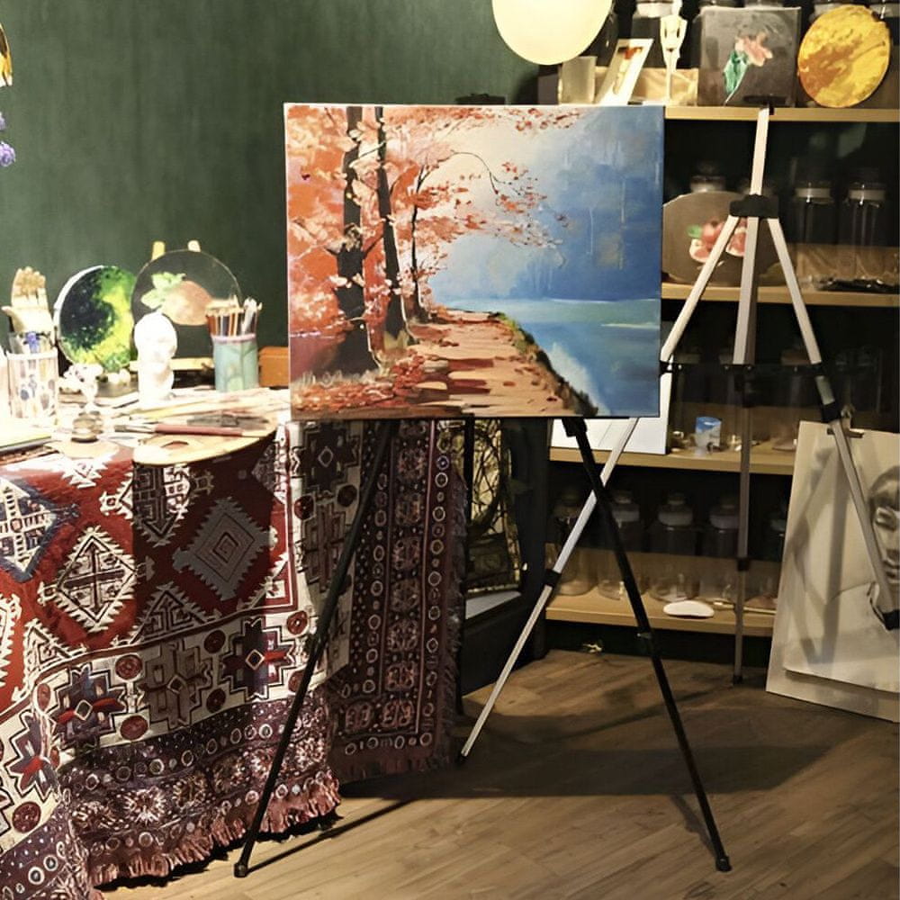 Slikarsko stojalo – železna konstrukcija, nastavljiva višina 77 – 160 cm, 3-segmentne noge zagotavljajo natančno nastavitev višine stojala, protizdrsne nogice, transportni kovček. Nanj lahko postavite platna in slikarske deske tako vertikalno kot horizontalno. Celoten opis