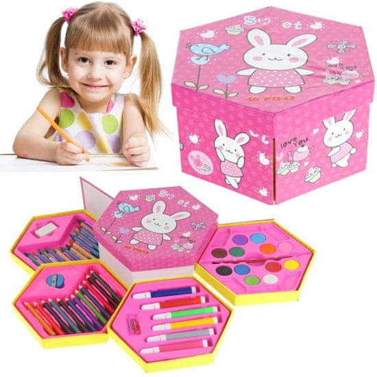 Komplet šolskih potrebščin za otroke bo odlično darilo za vsako priložnost. Risanje in slikanje prispevata k pravilnemu razvoju otrokove fine motorike. Spodbuja ustvarjalnost, razgibava pa tudi otrokove možgane in ga pripravlja na učenje pisanja. Večbarvni komplet barvic, barv in flomastrov omogoča dolgo zabavo. Set je pakiran v pisani škatli. Po odprtju se komplet razmakne in ga razdeli na 4 predale, na katerih so nameščeni dodatki.
