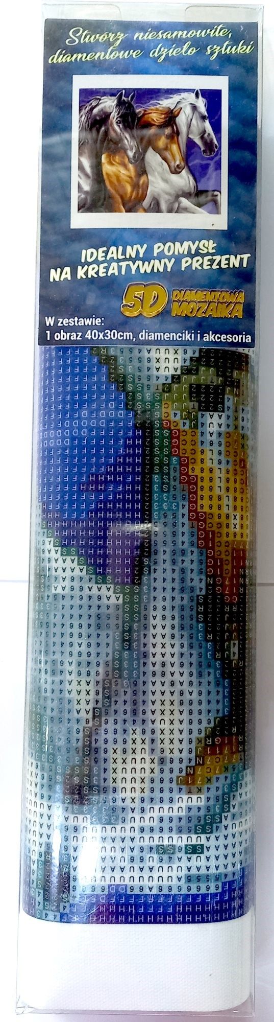 Paket vsebuje: platno s predtiskano sliko, pisalo za nanašanje kamenčkov, posodico za vlivanje kamenčkov, vosek za lepljenje, set barvnih kamenčkov