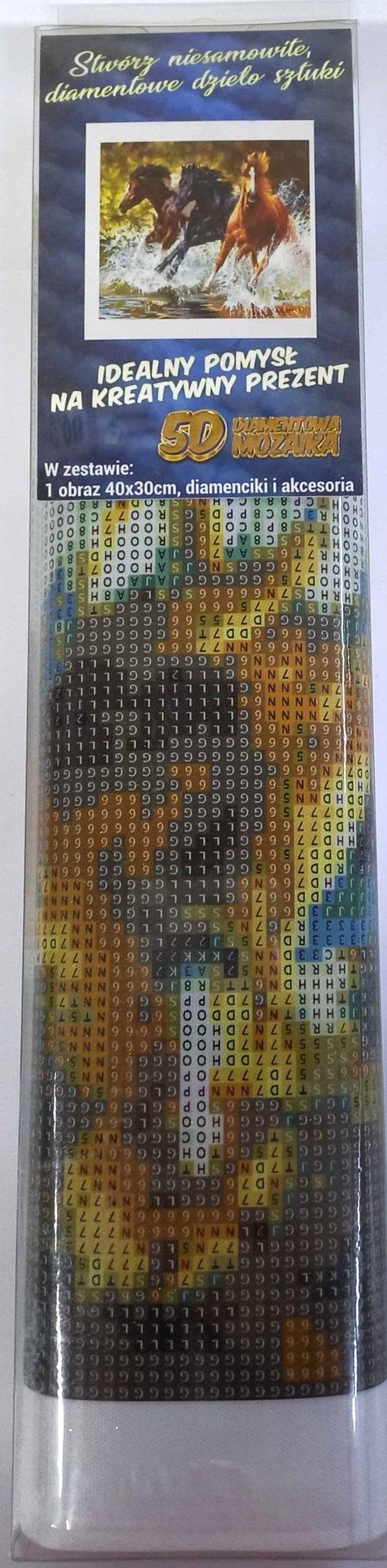 Paket vsebuje: platno s predtiskano sliko, pisalo za nanašanje kamenčkov, posodico za vlivanje kamenčkov, vosek za lepljenje, set barvnih kamenčkov