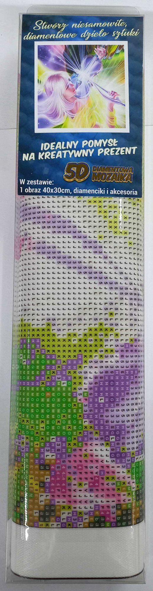 Paket vsebuje: platno z vnaprej natisnjeno sliko, pisalo za nanašanje kamenčkov, skledo za vlivanje kamenčkov, vosek za lepljenje, komplet barvnih kamenčkov Slikanje diamantov – postopek. Folija se odstranjuje po delih, medtem ko nanašate kamne. Če odstranite vso folijo naenkrat, se lahko lepilna plast umaže in kamenčki se ne bodo tako dobro prilepili. Platno vsebuje simbole, navedene v priloženi legendi, ki se nanašajo na ustrezno vrečko s kamenčki, označeno s številko. Kamenčke iz te vrečke izpraznite v skledo. V konico pisala naberite vosek, da se bodo kamenčki lažje prilepili na pisalo. S pisalom nanesite kamenčke na sliko. Ko je barva nanesena, kamenčke vrnite v vrečko in nadaljujte z naslednjo barvo.