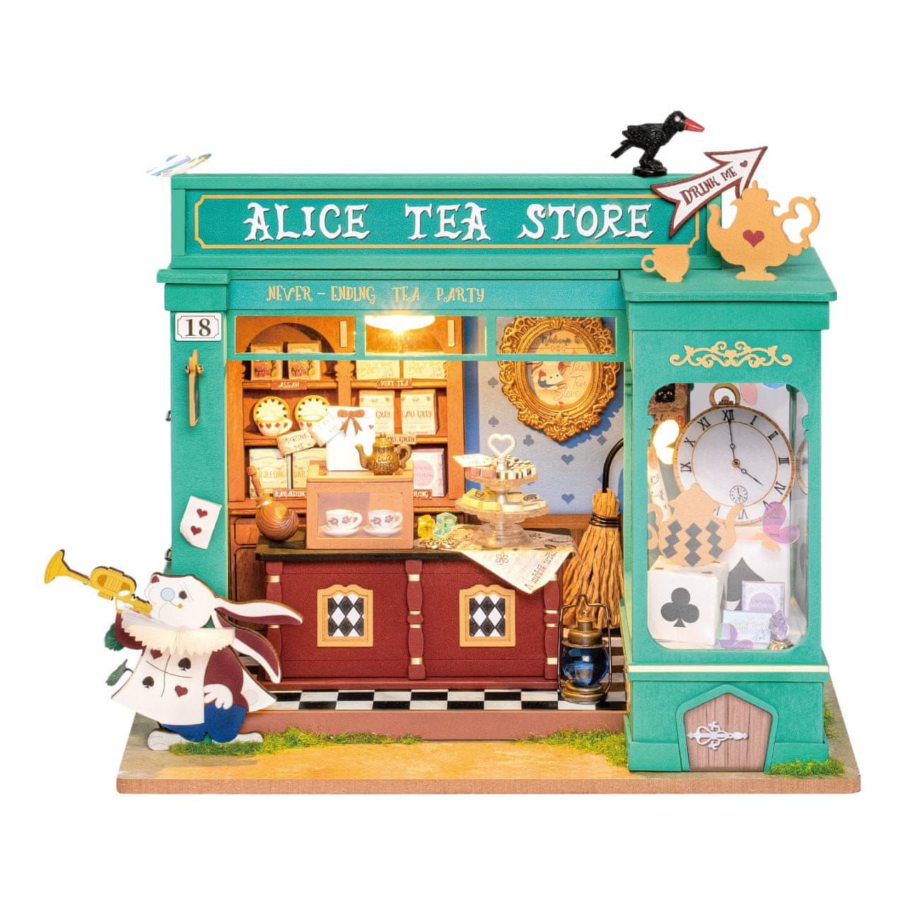 Naj vas omamna aroma popelje v kraljestvo čaja v ozadju svetovno znanih del o Alici. Privoščite si čajanko z Belim zajcem in Klobučarjem! Odkrijte svet podrobnih miniatur Robotime, ki prihajajo v obliki edinstvenih umetniških kompletov. Pri njihovem sestavljanju se boste odlično zabavali, rezultat pa lahko polepša kotičke vaše sobe. Skoraj vsak komplet je opremljen z osvetlitvijo LED, ki skupaj z barvitostjo modela, ki nastane, pričara prijetno vzdušje. Umetniški kompleti so razdeljeni v več različnih serij in tvorijo izjemno raznoliko ponudbo. Želite bivalni prostor, poslovni prostor ali kaj drugega? Izbira je preprosta! Vsak od kompletov je dobavljen v razgrnjenem stanju. Gradnja obsega predvsem barvanje in lepljenje že izrezanih vezanih delov, pripravo elementov iz kartona ali blaga in papirnatih odtisov. Lepilo, barva, čopič in drugo orodje so vključeni v paketu skupaj z vsemi deli in podrobnimi navodili. Priporočamo, da s seboj prinesete par polkrožnih klešč za udobno namestitev razsvetljave. Praviloma pa lahko zadostujete z navadnimi škarjami, ki jih vedno najdete doma. Glavne značilnosti:vsebuje dele kompleta, lepilo, barve, čopič itd.predvideničas sestavljanja 10 urLED osvetlitev (2×AAA bateriji nista vključeni)za sestavljanje so potrebne lastne škarje, morda pa boste uporabili tudi drugo manjše orodje