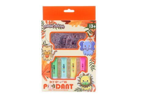 Ustvarjalni set – izdelava in poslikava obeskov z živalskim motivom. Paket vsebuje 6 plastičnih obeskov, 4 barve, bleščice in vrvico. Pakirano v škatli. Dimenzije paketa so približno 13×20×3,5 cm. Velikost obeska približno 8 cm. Starost 3+