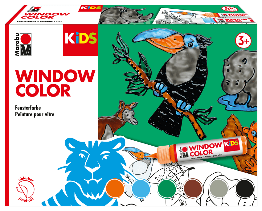 Barvita džungla pri vas doma! Komplet vsebuje 6 plastenk (25 ml) lepljivih barv Marabu Window Color KiDS (013 – oranžna, 090 – svetlo modra, 067 – zelena, 046 – srednje rjava, 178 – siva, 073 – črna kontura), prosojno folijo velikosti A4, predlogo velikosti A3 s 16 tematskimi, džungelskimi motivi (nilski konj, kakadu, opica, …) ter navodila za uporabo.