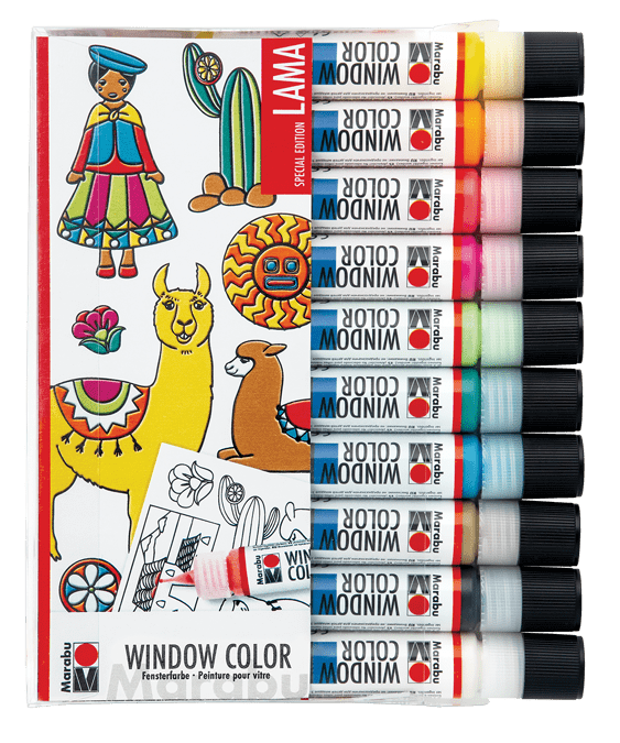 Prikupne lame pri vas doma! Komplet vsebuje 10 plastenk (25 ml) lepljivih barv Marabu Fun & fancy (005 – malinasta, 013 – oranžna, 019 – rumena, 031 – češnjevo rdeča, 047 – svetlo rjava, 061 – bledo zelena, 067 – bujno zelena, 070 – bela, 073 – črna kontura in 098 – turkizna), predlogo s 16 tematskimi motivi „lama“ ter navodila za uporabo.