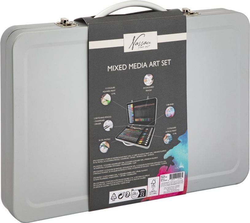12 akvarelnih barv 12 ml, 12 akrilnih barv 12 ml, 24 barvic, 2 čopiča, 36 oljnih pastelov, 2 svinčnika za risanje, ostružek za svinčnike, radirka.