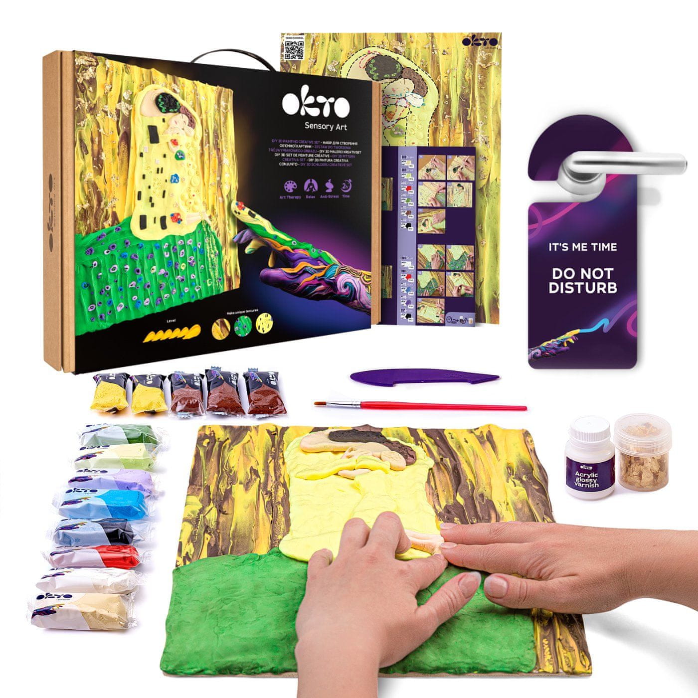 OKTO SENSOTY ART umetniški set „Poljub“ Velikost platna 30×40cm. Vsebina paketa: naravno platno, navodila, leseno orodje za oblikovanje, komplet za modeliranje, akrilni lak (na vodni osnovi) 20 ml, čopič.