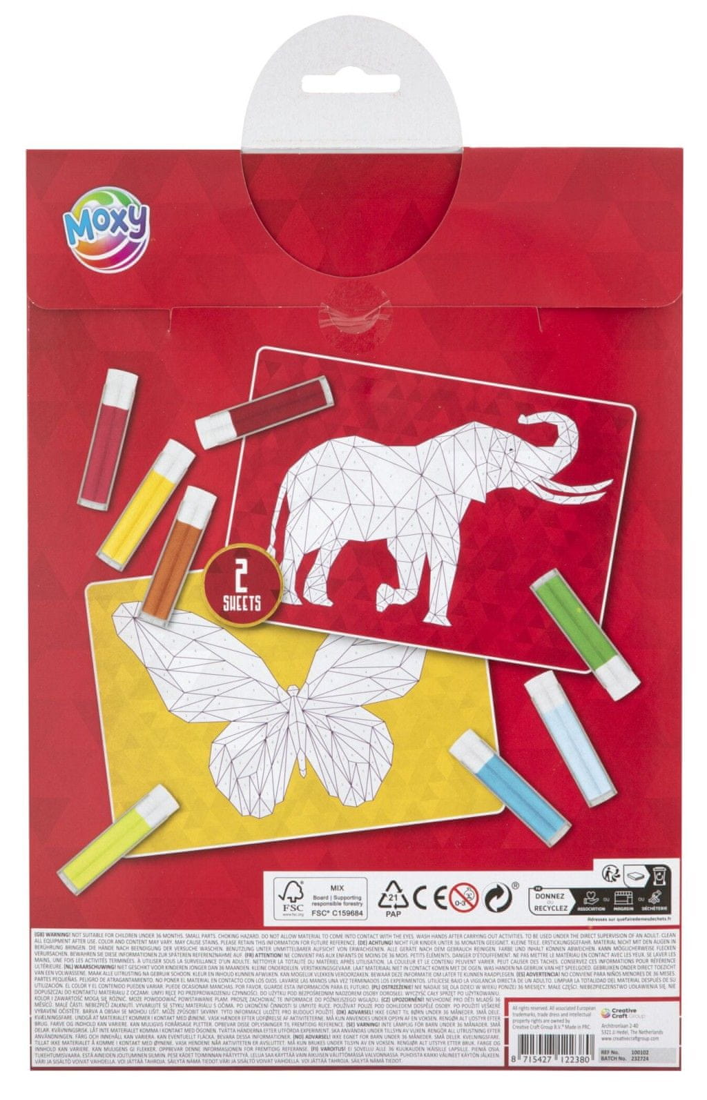 Slikanje s peskom s številkami Enorog/Deževnica in Slon/Metulj – velikost A4. Paket vsebuje dve sliki z lepljivo površino, 8 barvnih peskov v stekleni tubi (modro-zeleni, rožnati, rdeči, svetlo modri, temno modri, rumeni, bež in zeleni). Postopek – najprej odlepite obrobni del slike in jo posujte s peskom, odvečni pesek vrnite v epruveto in postopoma odstranite druge dele.