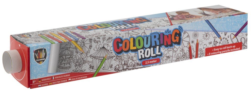 Barvni zvitek z vnaprej natisnjenimi slikami – dolžina zvitka 2,5 m. Vključenih je 6 barvic. Zelo enostaven za zvijanje naprej in nazaj.