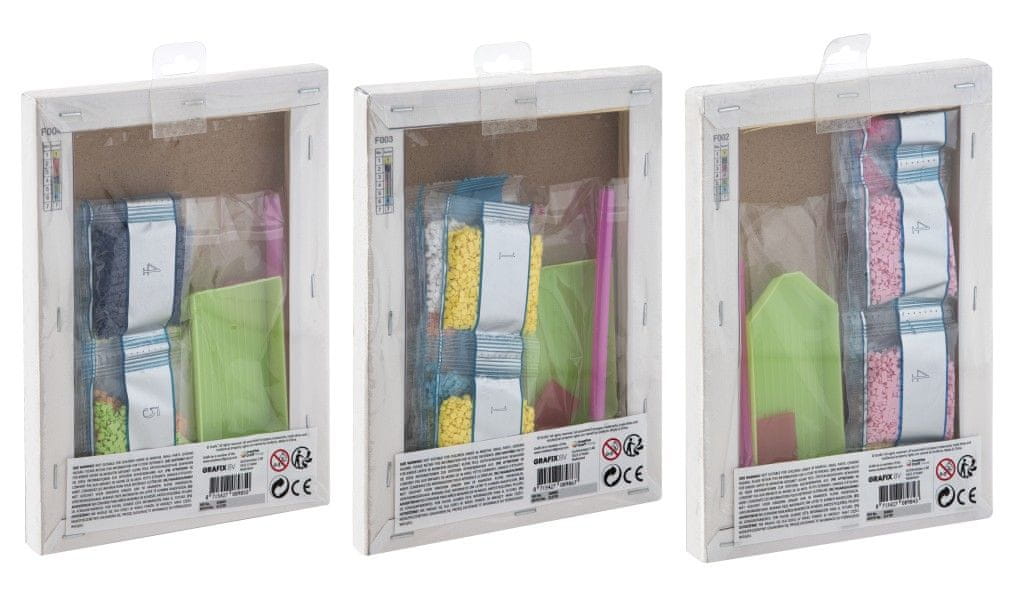 Slikanje z diamantnimi pikami na platno – s pomočjo kamnov v obliki pik ustvarite sliko v velikosti 20 × 15 cm na vnaprej natisnjeni predlogi. Paket vsebuje 7 barv pikslov. Aplikator in platno. Trije različni vzorci.