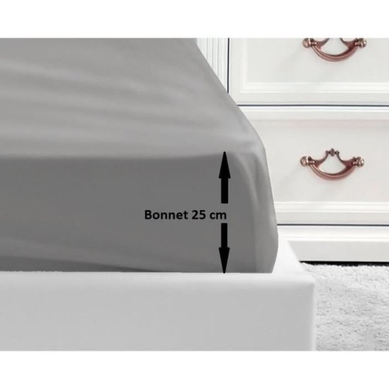 Oprijeta rjuha 100% tesno tkan bombaž 54 niti svetlo siva. S kapico 25 cm. Za zakonsko posteljo. Pralno v pralnem stroju na 40°C, certifikat OeKO-TEX. Dimenzije: 180 × 200 cm.