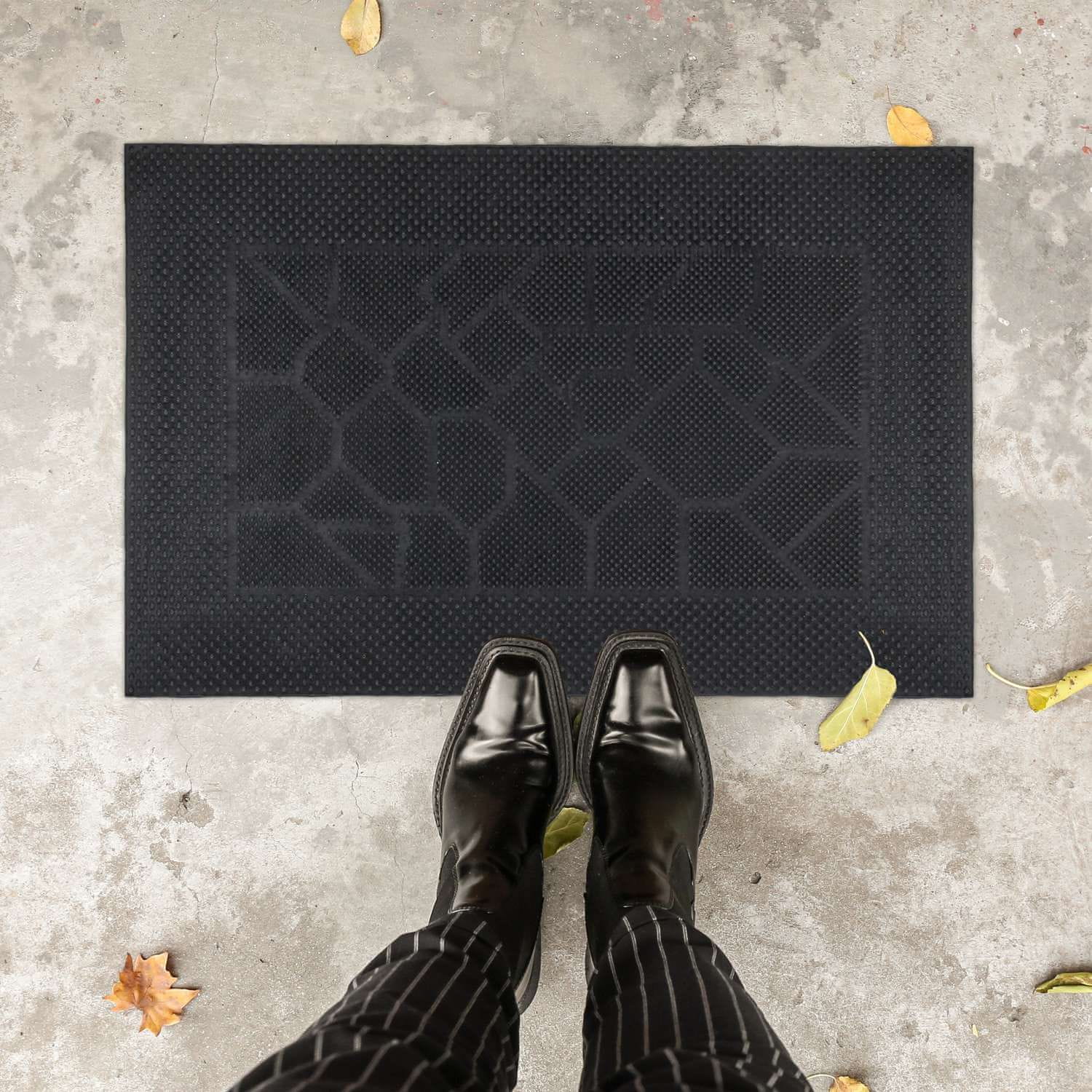 Črna vhodna preproga z mozolji učinkovito ujame umazanijo in vlago ter ohranja vaš dom čist. Ta trpežna gumijasta podloga ima eleganten abstrakten vzorec in jo je enostavno očistiti z vodo.