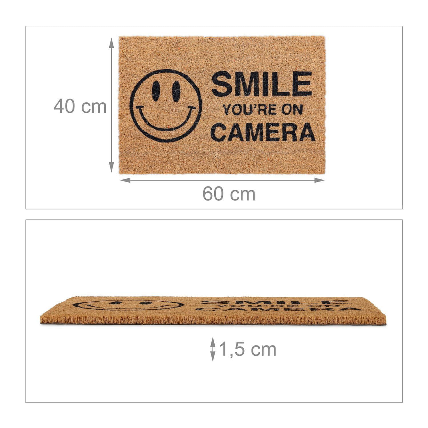 Polepšajte svoj vhod z robustnim predpražnikom iz kokosovih vlaken, popolnim za notranjo in zunanjo uporabo. Ta trpežna podloga ima besedilo ""Nasmehni se, da si pred kamero,"" in nudi tako stil kot funkcionalnost.