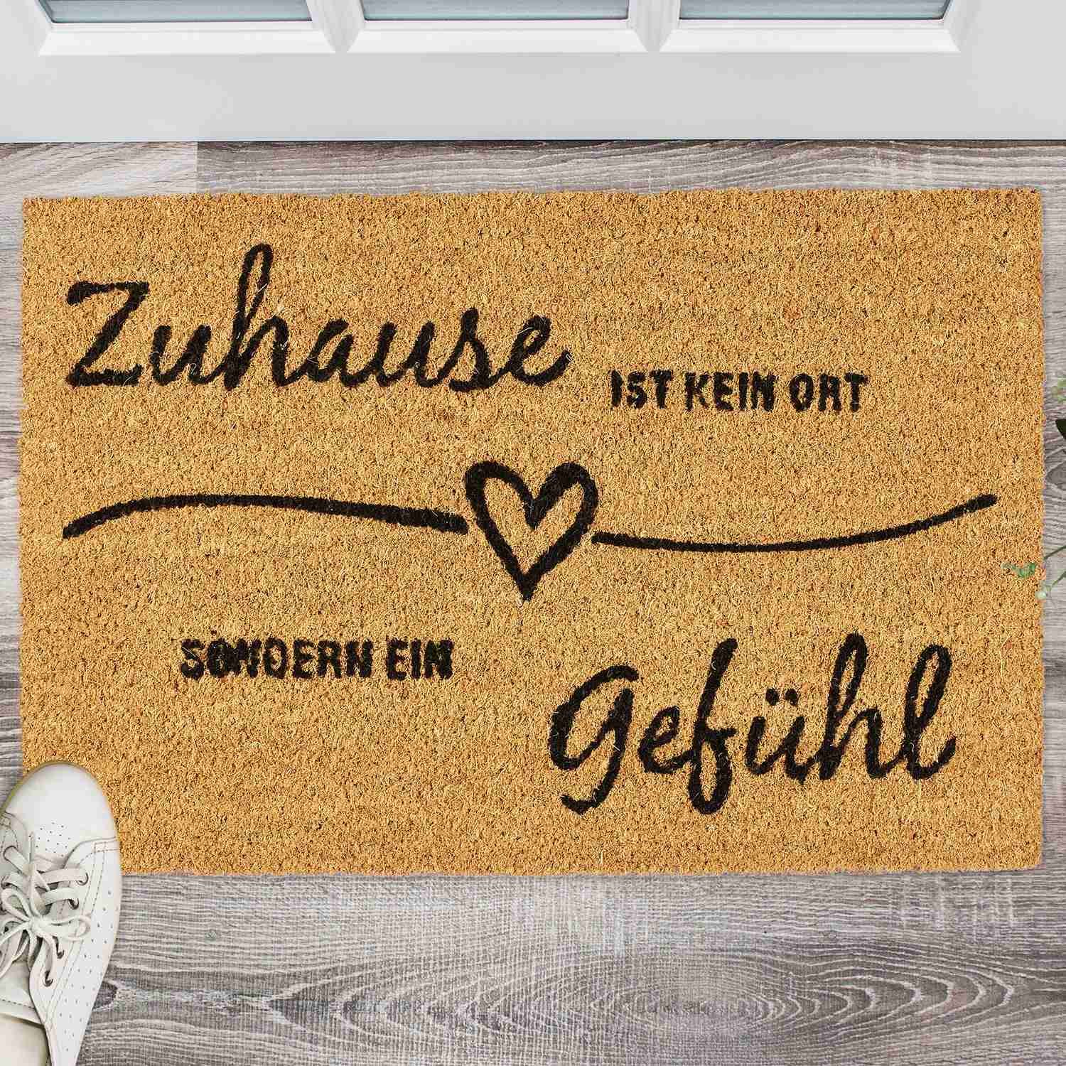 Polepšajte svoj vhod s kokosovim predpražnikom, ki goste sprejme s toplino in stilom. Ta podloga z besedno zvezo ""Dom ni prostor, ampak občutek"" združuje eleganco s funkcionalnostjo.