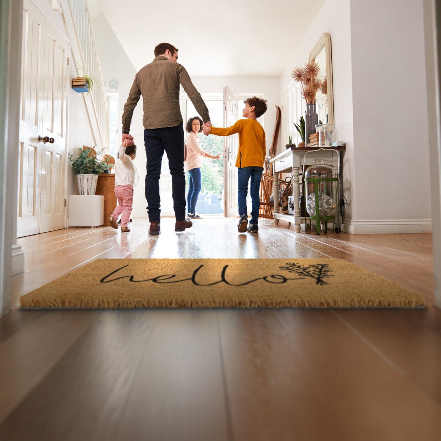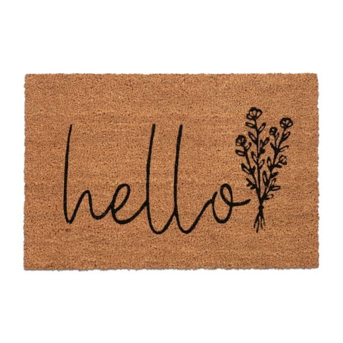 Polepšajte svoj vhod z okrasnim predpražnikom iz kokosovega vlakna z očarljivim napisom »Pozdravljeni« in cvetličnim motivom. Ta trpežna podloga, odporna na vremenske vplive, je popolna za notranjo in zunanjo uporabo.