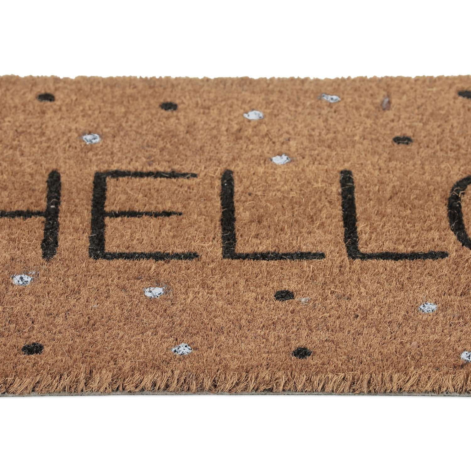 Zaželite dobrodošlico gostom z elegantnim predpražnikom iz kokosovih vlaken z napisom „Hello“ in veselimi pikami. Ta podloga v naravni barvi združuje vzdržljivost in okolju prijaznost ter zagotavlja toplo in proti zdrsu odporno vhodno pot.