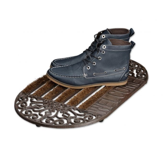 Okrasni predpražnik s ščetkami nudi temeljito čiščenje čevljev z integriranimi ščetkami in elegantnim dizajnom. Idealno za popestritev vhodnih vrat s pridihom starinskega šarma.