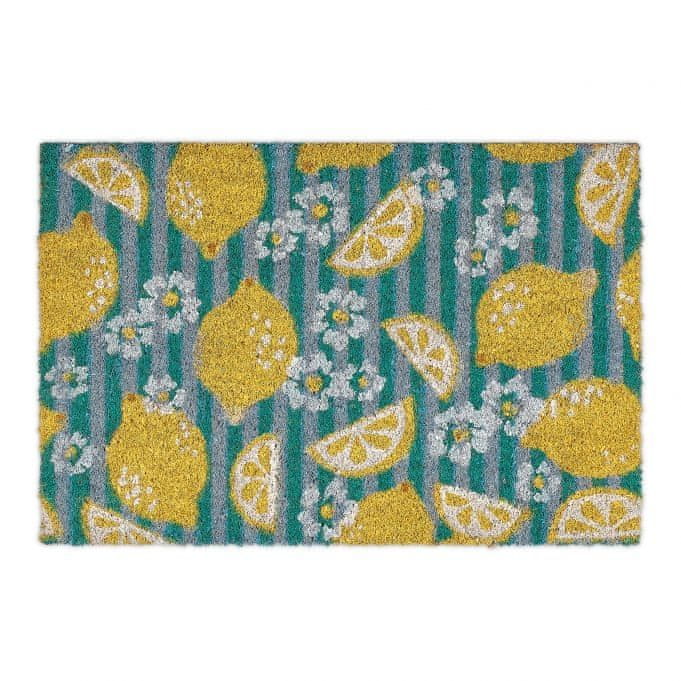 Polepšajte svoj vhod z zelenim črtastim predpražnikom z limonami in rožami, ki ponuja svež, poletni pridih. Ta podloga, izdelana iz trpežnih kokosovih vlaken, je okolju prijazna in funkcionalna.