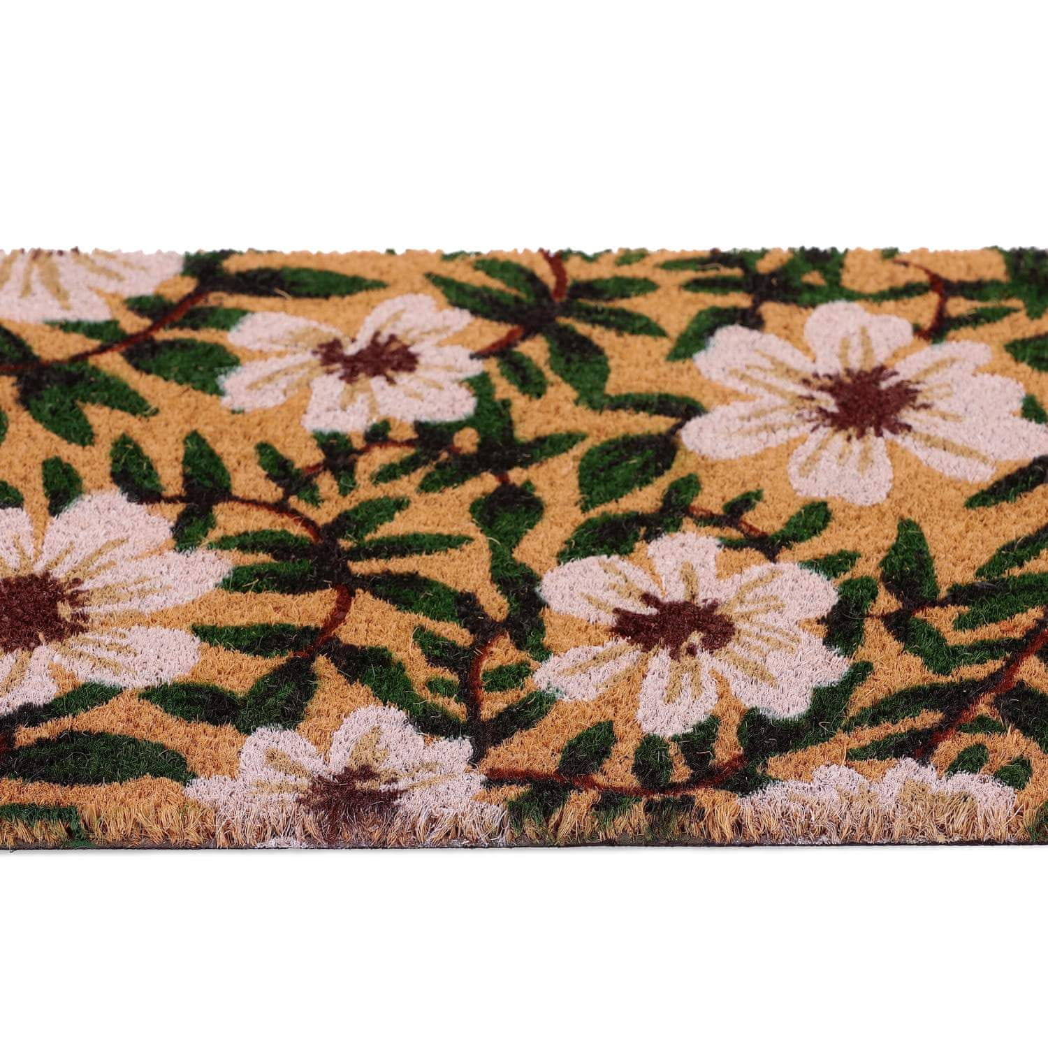 Polepšajte svoj vhod z robustnim predpražnikom iz kokosovih vlaken, zasnovanim za vzdržljivost in stil. Ta okrasna podloga z belimi cvetovi in zelenimi listi je popolna za zadrževanje umazanije.