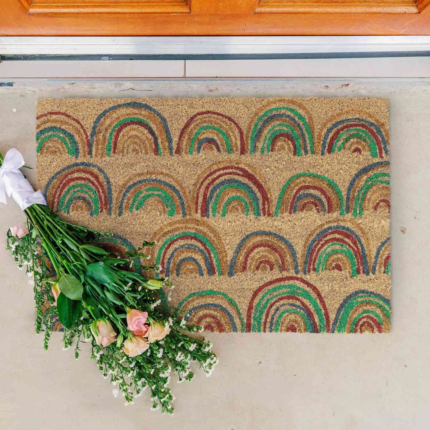 Polepšajte svoj vhod s kokosovim predpražnikom, ki nudi okolju prijazno vzdržljivost in očarljiv mavrični dizajn za notranjo in zunanjo uporabo.