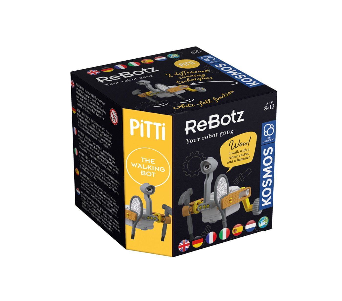 KOSMOS Robot Pitti walking. 3×AAA baterije niso vključene. Vključuje dele za sestavljanje robota, nalepke. Priporočena starost od 8 do 12 let. Češka navodila so na voljo za digitalni prenos-QR koda na škatli in v navodilih.