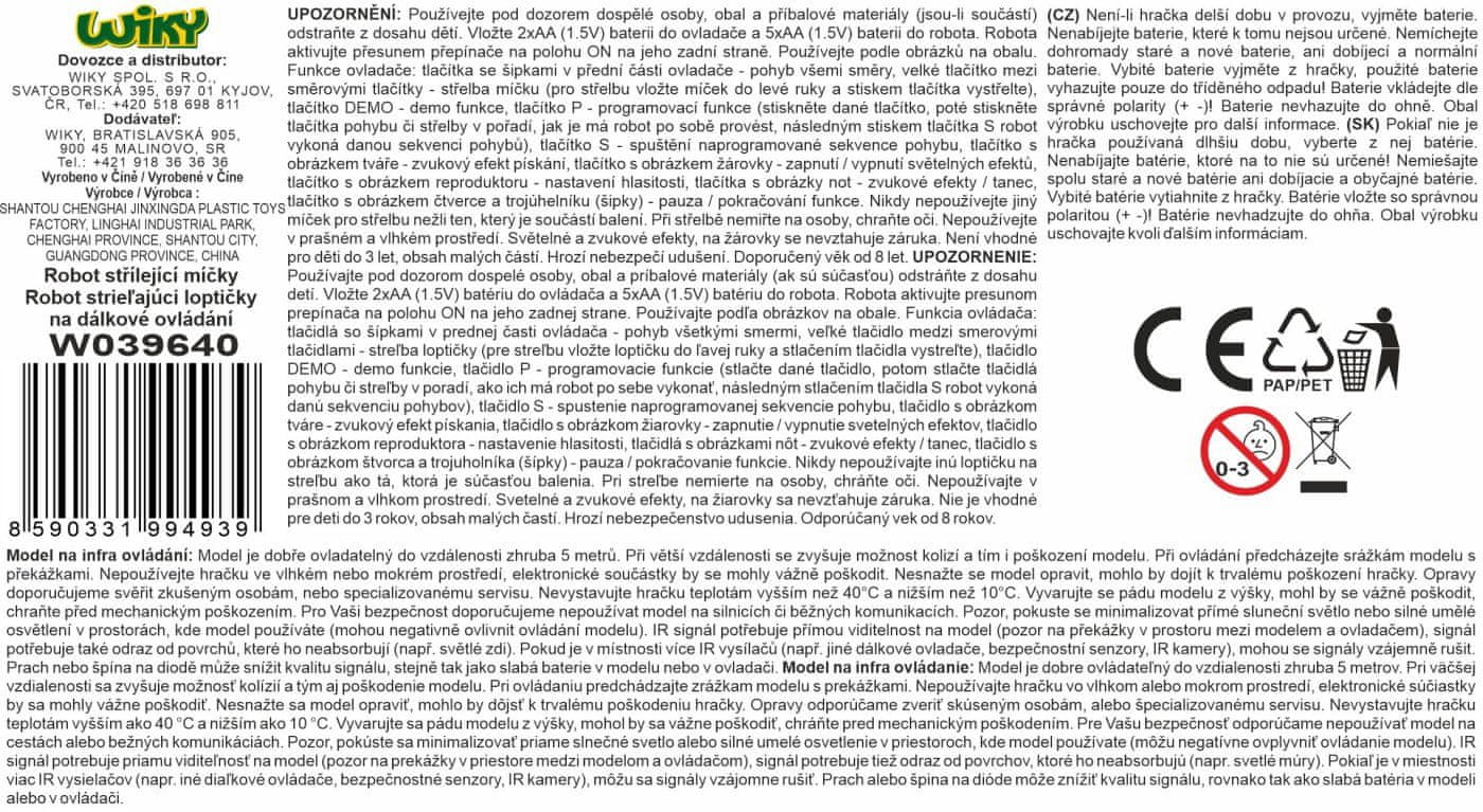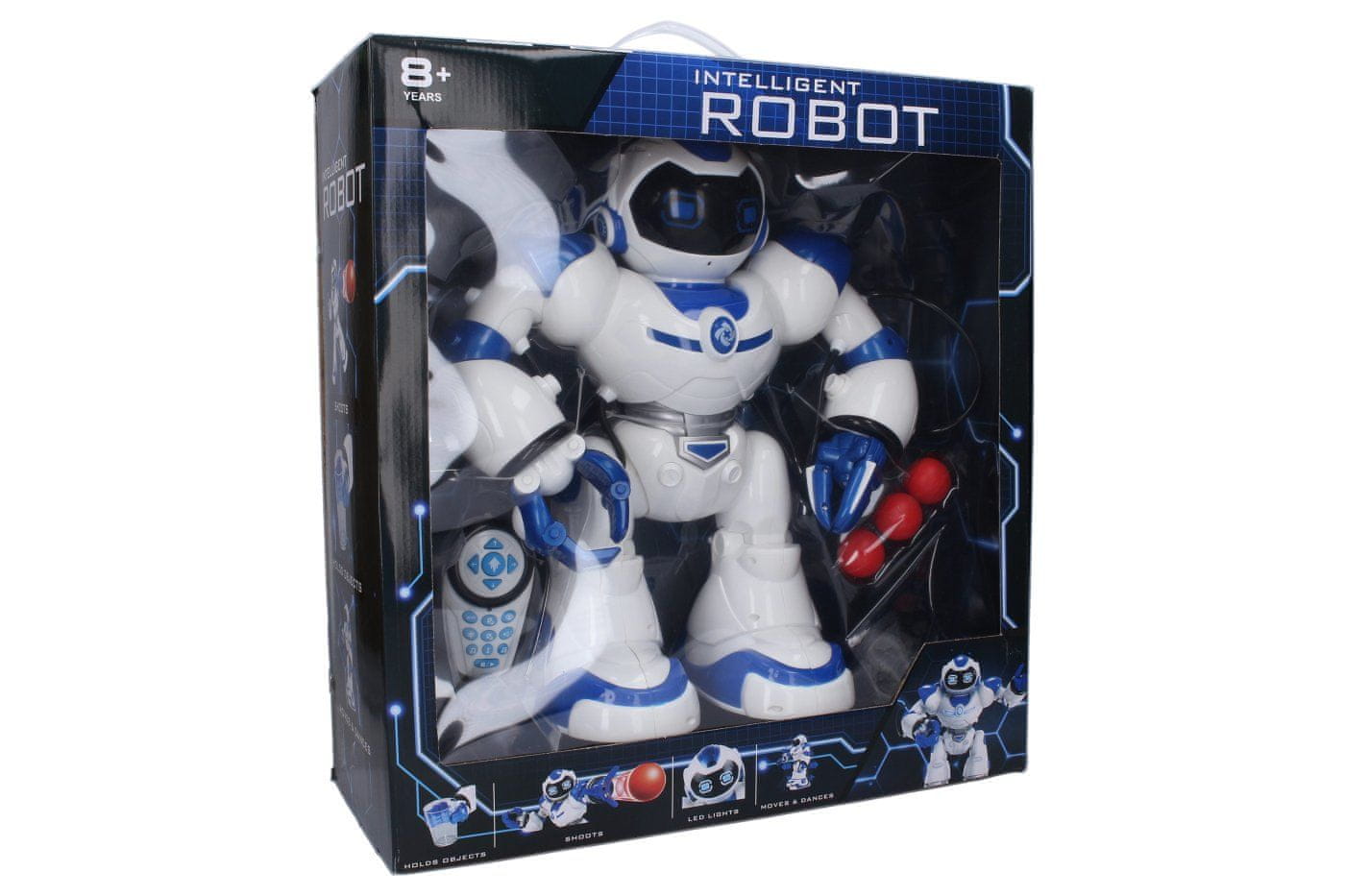 Robot za streljanje kroglic RC z daljinskim upravljalnikom. Dimenzije 36×17×40 cm. Infrardeča vrata. Ustvarja svetlobne in zvočne učinke. Funkcije – streljanje žogic iz leve roke, držanje predmetov v desni roki, osvetljen obraz, programiranje, hoja, ples, glasba, demo način, nastavitev glasnosti. Vključuje 3 žogice. Baterije 5×AA (1,5 V) za robota, baterije 2×AA (1,5 V) za krmilnik niso vključene.