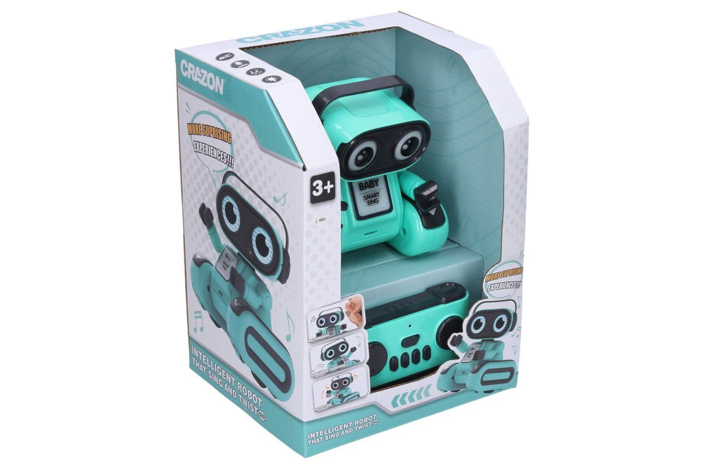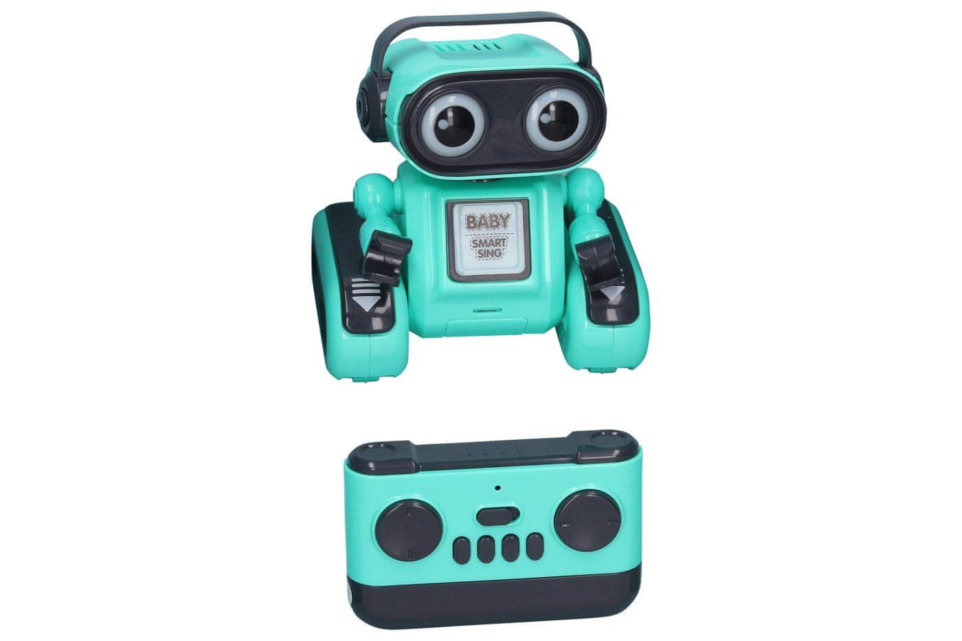 Robot Baby ponavlja RC daljinski upravljalnik. Dimenzije 11,8×9,5×13 cm. Frekvenca 2,4 GHz. Svetlobni in zvočni učinki. Baterija 3,7 V500 mAh za robota je vključena, 2×AAA za krmilnik ni vključena. Priložen je kabel USB. Vklop/izklop na hrbtni strani robota. Krmilnik – ON/OFF, premikanje naprej, nazaj, vrtenje levo, desno, ples, petje, ponavljanje povedanega. Ročno premikajoča se glava in roke. Polnjenje 1 h, delovanje do 2 h.