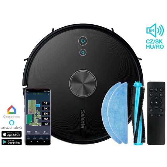 Aplikacija Salente omogoča daljinsko upravljanje sesalnika z mobilnim telefonom ali tablico. Obvešča vas o trenutnem stanju sesalnika, lahko zaženete različne načine čiščenja ali nastavite nivoje sesanja ali brisanja. Aplikacija je zasnovana za operacijska sistema Android in iOS. Če niste ljubitelj mobilnih aplikacij, lahko sesalnik upravljate tudi s priloženim daljinskim upravljalnikom ali z gumbi na sesalniku.