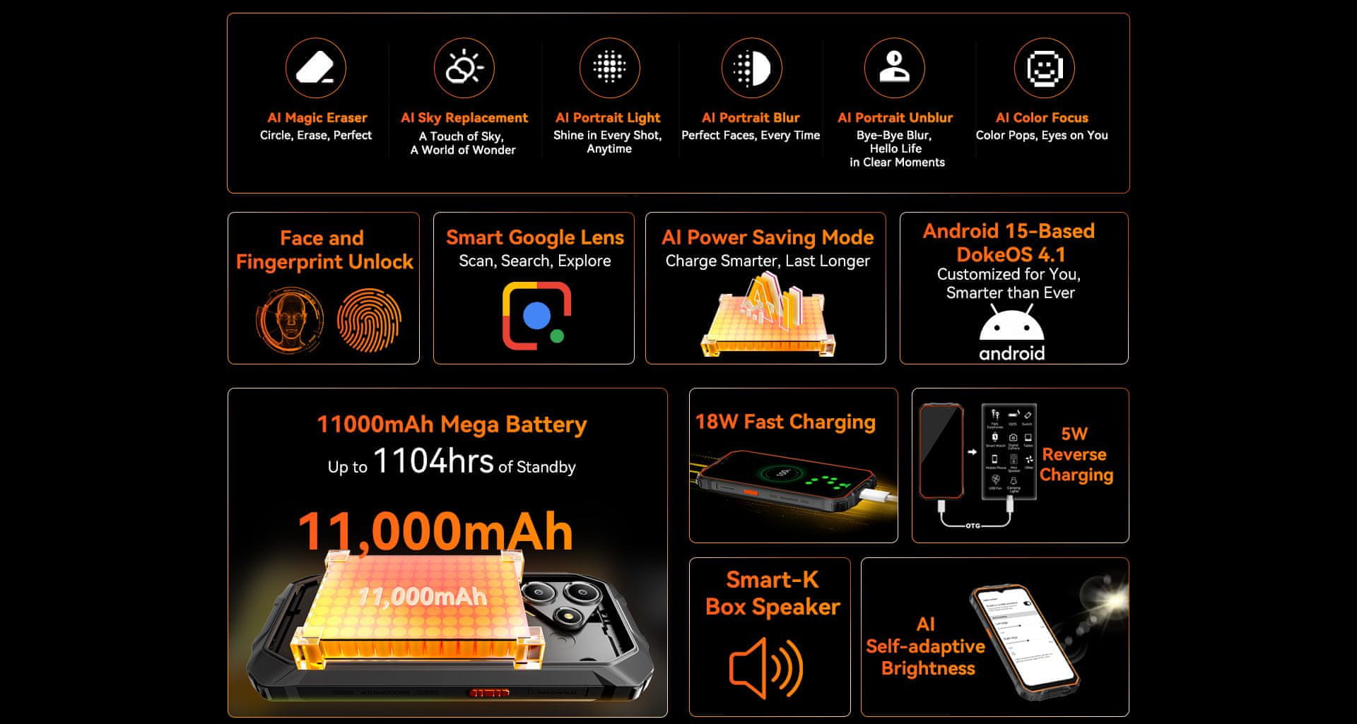 Zakaj izbrati OSCAL MARINE 2?AI Magic v vsakem koraku — poenostavi interakcije, dovrši vsak posnetek, naredi uporabo enostavno in intuitivno. Neustavljiva zabava z največjo baterijo doslej — 11.000 mAh zagotavlja delovanje, ki traja dlje, skupaj z AI 90 Hz zaslonom, ki omogoča tekoče drsenje in izkušnjo brez zatikanja. Vojaška trpežnost — z zaščito IP68 in IP69K ter standardom MIL-STD-810H je telefon zgrajen, da prenese padce, potopitve, udarce in razmere od –20 °C do +60 °C. Do 24 GB RAM in 256 GB ROM — kombinacija visokih zmogljivosti in hitrega procesorja T615 omogoča gladko delovanje. Nadgrajen DokeOS 4.1 (Android 15) — gladkejša interakcija, večja prilagoditev in napredna AI podpora.