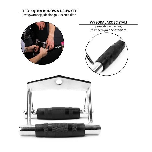 UW04B Holder HMS je dvojni ročaj, namenjen za vadbo zgornjega in spodnjega dviga. Uporablja se za vadbo hrbtnih mišic, dobro pa se obnese tudi pri vajah s polovico uteži (druga polovica leži na tleh). Števila se popolnoma prilega sredini ročaja, kar vam omogoča, da prosto izvajate vajo veslanja, polovica štafete v padcu trupa.