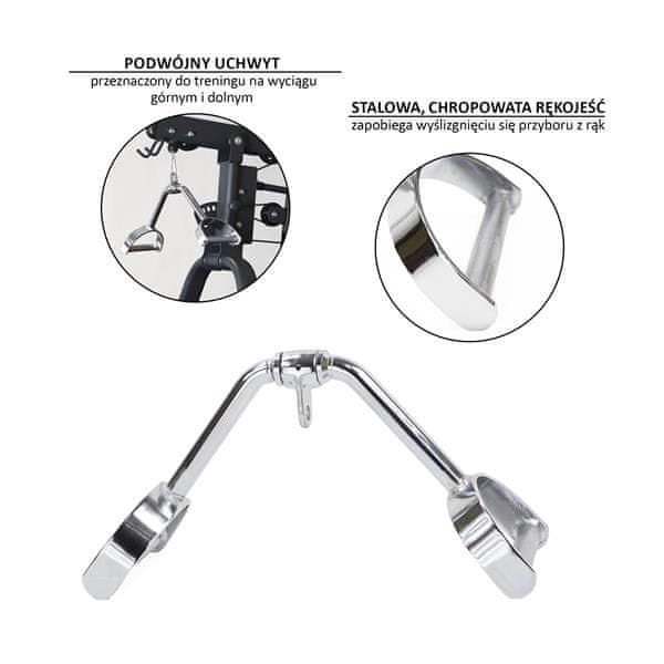 UW10 HMS je dvojni ročaj, zasnovan za vadbo na zgornjem in spodnjem dvigu. Uporablja se za vadbo hrbtnih mišic. Njegova oblika in položaj ročaja pod precejšnjim kotom omogoča maksimalen obseg gibanja, kar omogoča maksimalno napetost mišic. Zahvaljujoč temu bo naša vadba bolj učinkovita.