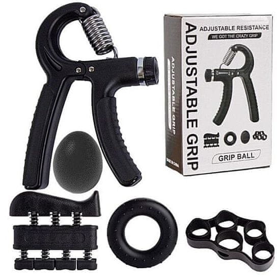 Ta komplet vključuje močne klešče z nastavljivo odpornostjo med 5 – 60 kg, trdnostni obroč s premerom 7 cm, gumijasto jajce višine 6 cm, vzmetno ojačitev in elastično silikonsko ojačitev za raztezanje prstov. Celoten komplet je v torbi z vrvico za enostavno shranjevanje in prenašanje.