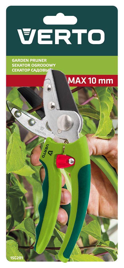 Vrtne škarje z nakovalom VERTO (ref. 15G201) so dolge 190 mm in imajo premer rezanja do 10 mm. Zasnovane so za obrezovanje cvetja in grmovnic. Rezilo dolžine 41 mm je prevlečeno s teflonom za zaščito pred korozijo in dolgo življenjsko dobo orodja. Zaklep rezila preprečuje, da bi se nenamerno odprlo. Ergonomski plastični ročaj, prevlečen z nedrsečim materialom, zagotavlja varnost in udobje med uporabo. Zaradi ozke širine oprijema je orodje primerno tudi za ženske roke.