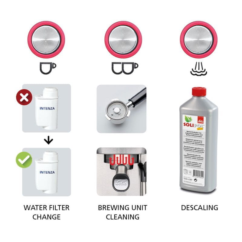 Spomni na menjavo filtra za vodo, odstranjevanje vodnega kamna in čiščenje enote za pripravo kave. Vključuje samodejne programe čiščenja.