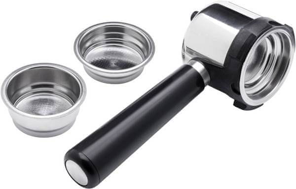 Priložena je filter ročka s tremi nastavki, ki omogoča pripravo ene ali dveh skodelic kave naenkrat. Višino aparata lahko prilagodite višini skodelic, in sicer espresso ali cappucino skodelicam ter kozarcem za latte machiatto. Vsi dodatki so pralni v pralnem stroju, pa tudi vzdrževanje kavnega aparata je preprosto zahvaljujoč ohišju iz Cromargana.