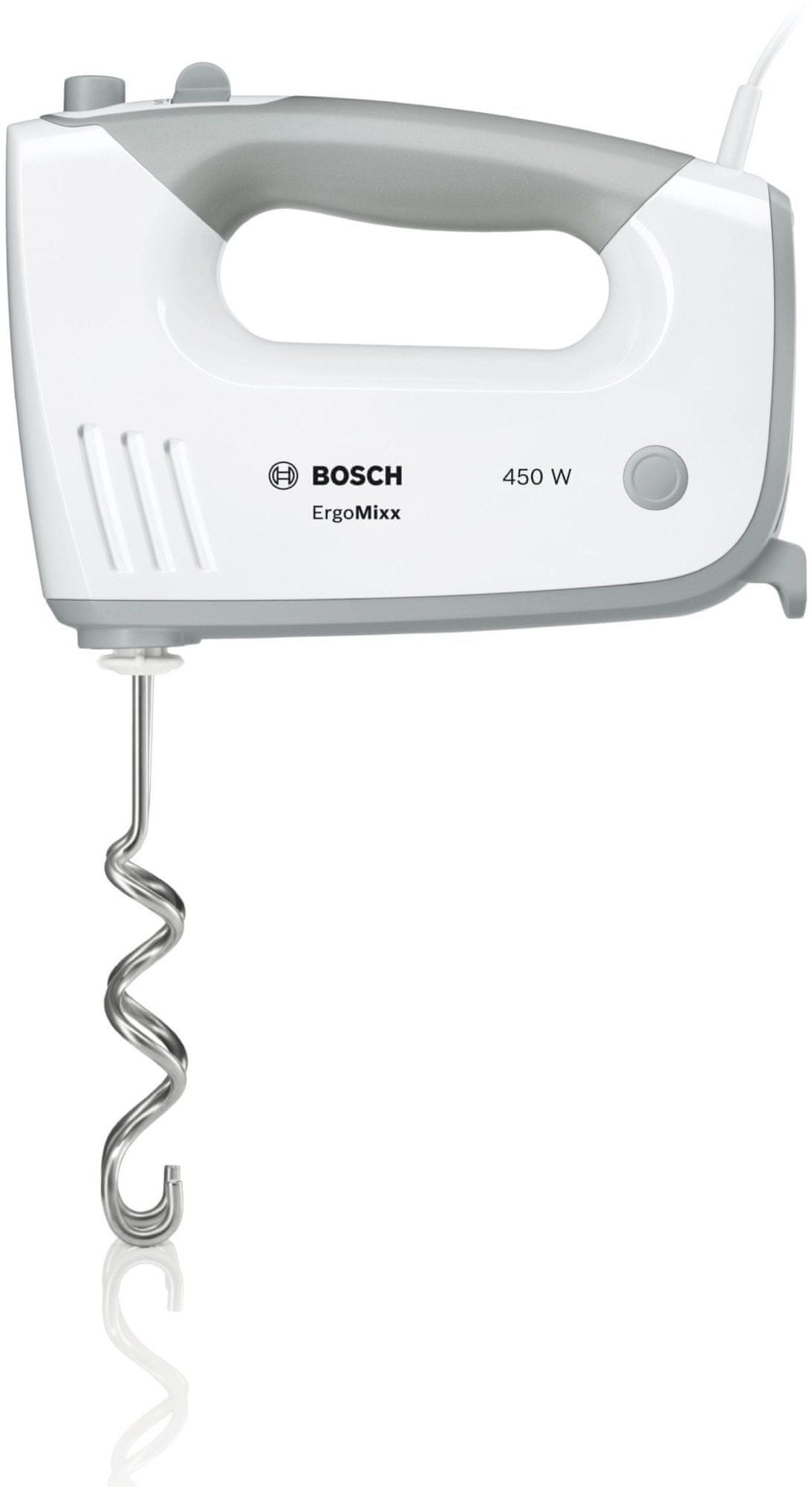 Ročni mešalnik Bosch ErgoMixx MFQ36480 je zasnovan za udobno in učinkovito delo v kuhinji, saj se zaradi ergonomskega ročaja s soft-touch prevleko popolnoma prilega dlani in omogoča varen oprijem. Zmogljiv in hkrati tih 450-vatni motor omogoča odlične rezultate pri stepanju, mešanju in gnetenju, pet nastavitev hitrosti ter funkcija turbo pa zagotavljajo natančen nadzor pri vsakem receptu.