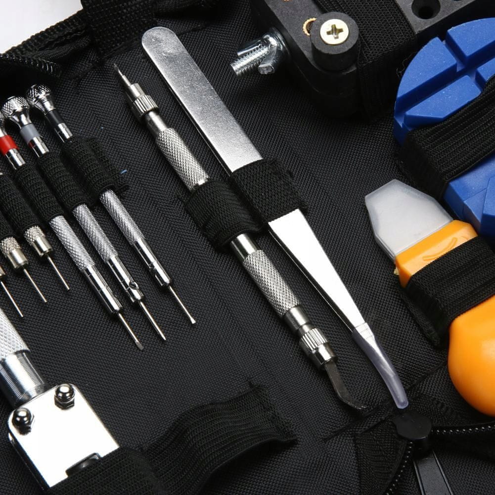 Nepogrešljiv komplet za popravilo ur, krajšanje zapestnic, zamenjavo trakov in drugo. Primeren je za domačo uporabo in za profesionalne urarje. Celoten opis