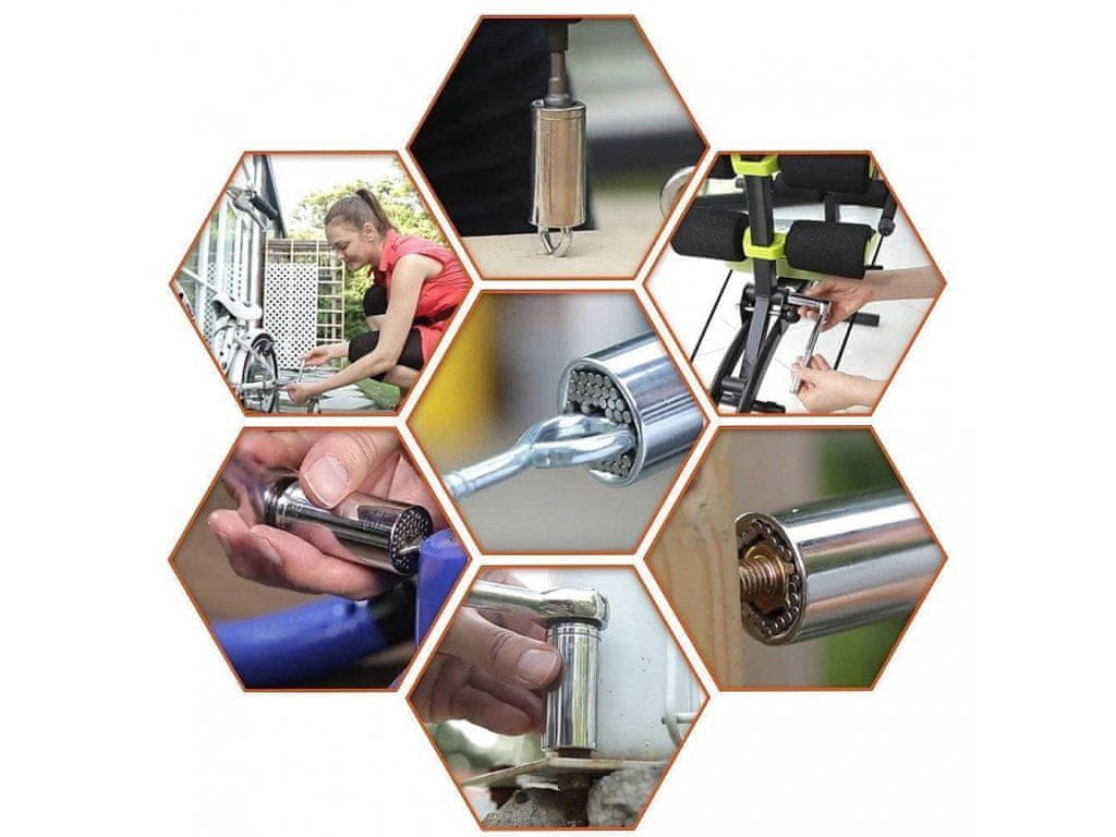Univerzalni nasadni ključ za privijanje vijakov in matic nadomešča različna orodja in ključe. S tem univerzalnim orodjem lahko zategnete matice in vijake velikosti 7 mm – 19 mm, kljuke, sponke, krilate matice, različne nepravilne oblike in še veliko več. Celoten opis