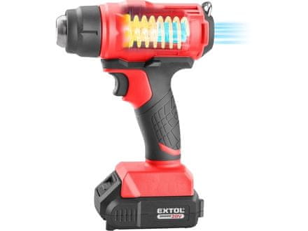 Akumulatorska pištola za vroč zrak s temperaturo zraka do 550 °C je namenjena za oblikovanje, krčenje in spajanje plastike, upogibanje plastičnih cevi, rahljanje lepljenih spojev ter odmrzovanje zamrznjenih cevi, odstranjevanje mahu in plevela v stikih pločnikov, prižiganje oglja za žar, sušenje itd. Uporablja se lahko tudi v manjšem obsegu za odstranjevanje starih barv in lakov. Pištola se v 5 sekundah po vklopu segreje na delovno temperaturo zaradi elektronskega nadzora gretja. Da bi podaljšali življenjsko dobo naprave, ventilator deluje še nekaj sekund po sprostitvi stikala, da ohladi grelno spiralo. Pištola je opremljena s svetilko LED, ki med delom osvetljuje delovno območje, in kljuko za obešanje. Priložene so tri zamenljive šobe – redukcijska šoba (ozek zračni tok): za zgoščevanje zračnega toka (toplote) na majhnem območju, npr. za spajkanje ali upogibanje pleksi stekla, široka šoba: za segrevanje širšega območja, cevna šoba: za segrevanje cevi. Zaradi vgrajenega zaznavnega obroča lahko vročo konico hitro odstranite iz pištole in jo zamenjate, ne da bi čakali, da se ohladi, ali da bi uporabili klešče. Za običajno delo zadostuje ena ali dve bateriji s kapaciteto 2000 mAh, ki jih lahko hitro napolnite v hitrem polnilniku, za zahtevnejše ali daljše delo pa priporočamo večje baterije s kapaciteto 4000–8000 mAh. Baterijo lahko uporabljate v vseh vrstah orodij serije EXTOL SHARE20V. Zaradi uporabljene litij-ionske tehnologije jo lahko kadar koli ponovno napolnite, ne da bi se zmanjšala njena zmogljivost. Li-ionska baterija zelo počasi izgublja energijo zaradi samopraznjenja in dolgo časa zdrži napolnjena in pripravljena za uporabo.