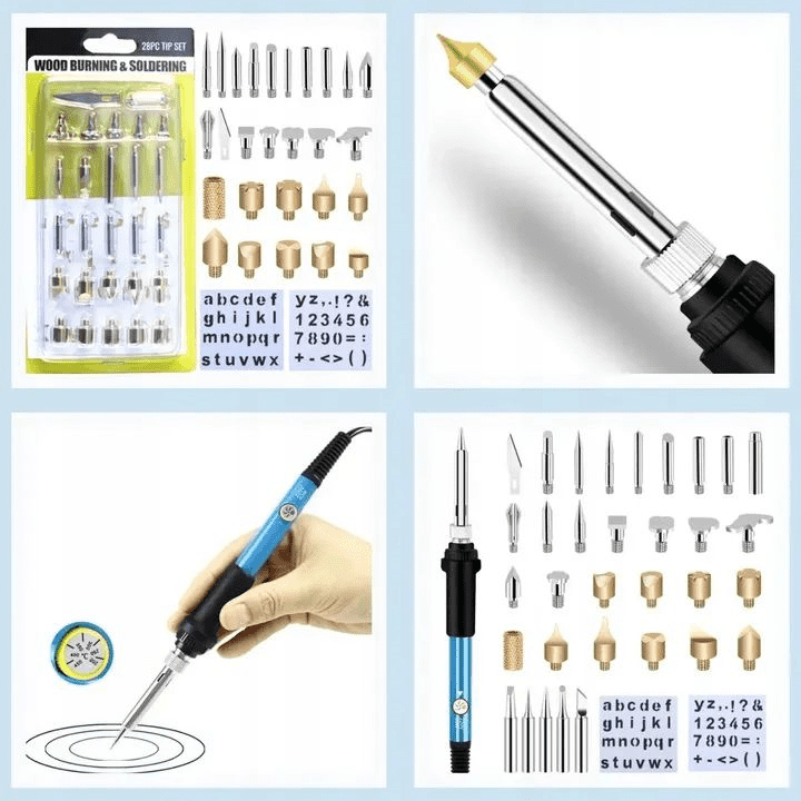 Komplet 81-delni 60W pirograf + spajkalnik z regulacijo temperature. 26 konic za les, 6 za spajkanje, šablone, lesene ploščice, etui. Celoten opis