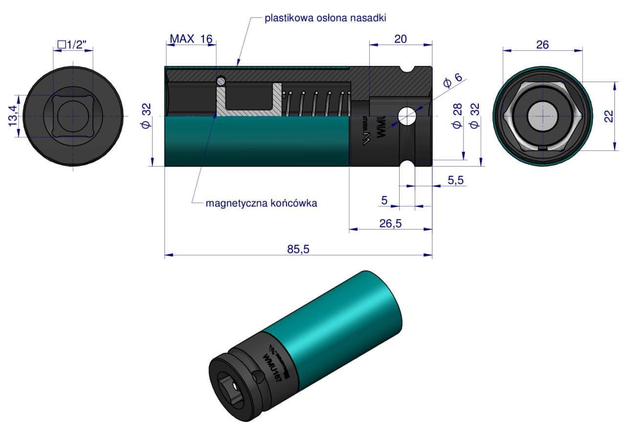 1/2 CrMo jekleni udarni nastavek 22 mm z magnetom in pokrovom za aluminijasta platišča Waryński Celoten opis
