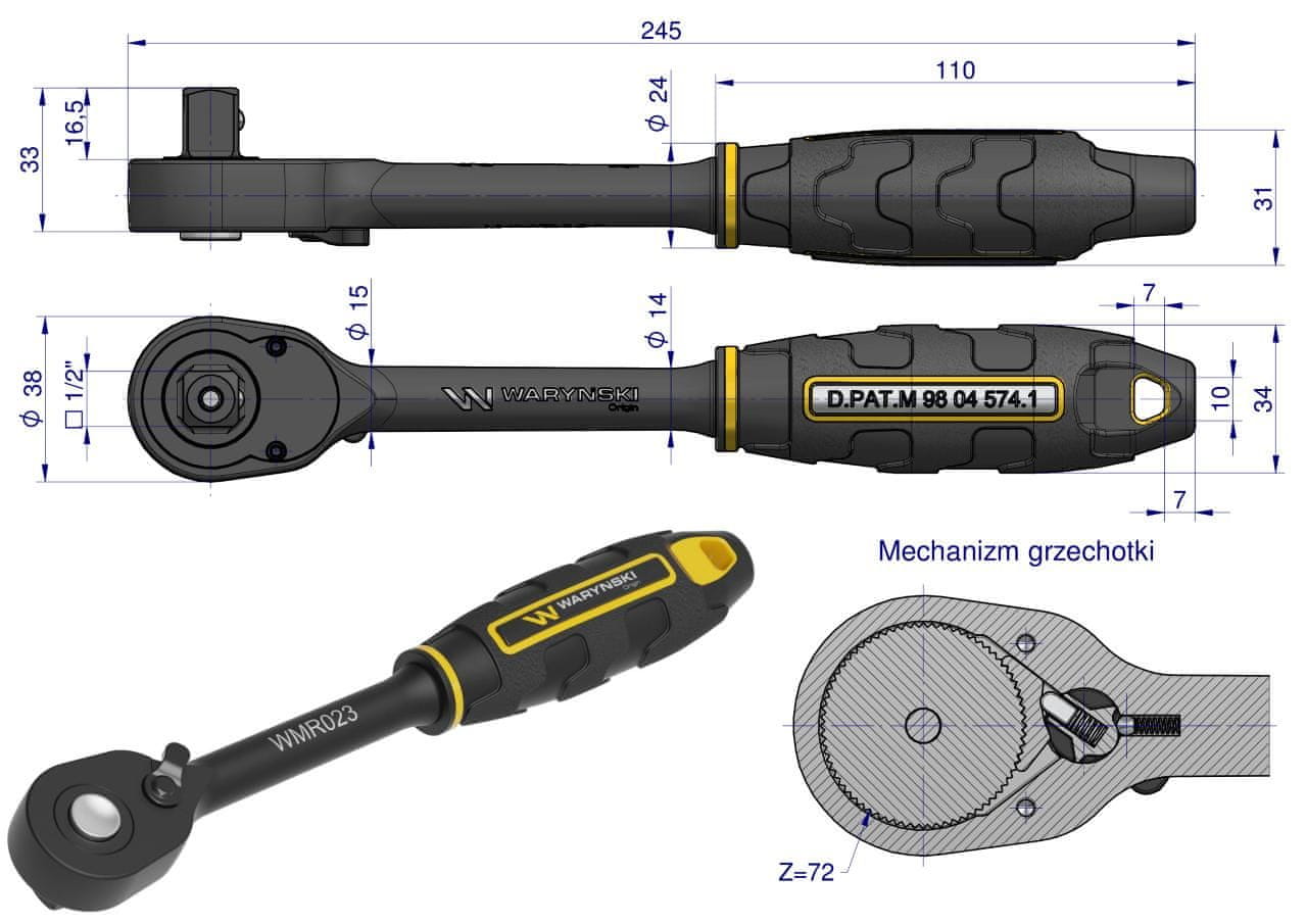 1/2-palčna raglja z ojačanim zaskočnim mehanizmom iz CrMo jekla, odpornega na poškodbe, 50 % večja pretržna trdnost od standarda DIN3122, majhen delovni hod, 72 zob na glavnem zobniku, Waryński MAXX