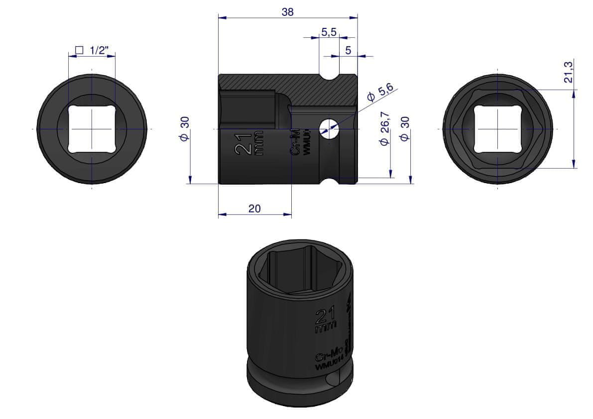 1/2" šesterokotni udarni ključ. 21 mm. CrMo. DIN 3129. Waryński Celoten opis