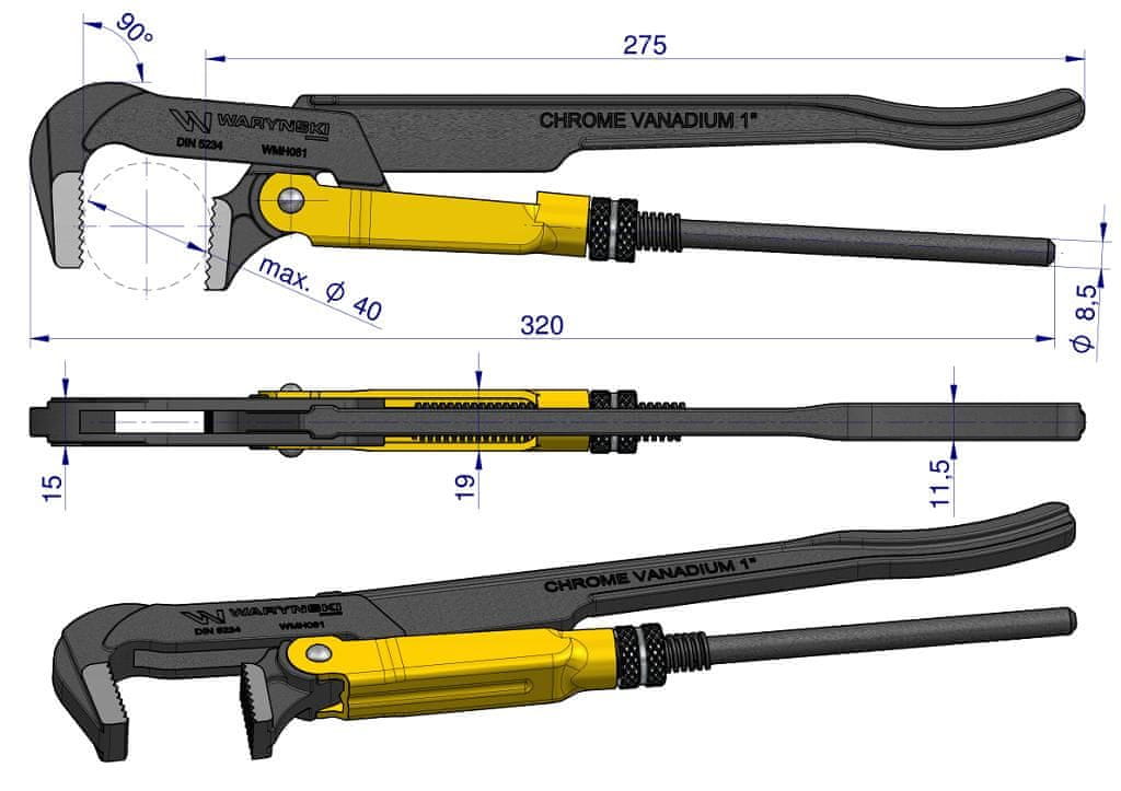 1" švedske nastavljive klešče za cevi, tip čeljusti 90°, maks. razmik 40 mm, dolžina 320 mm Waryński Celoten opis