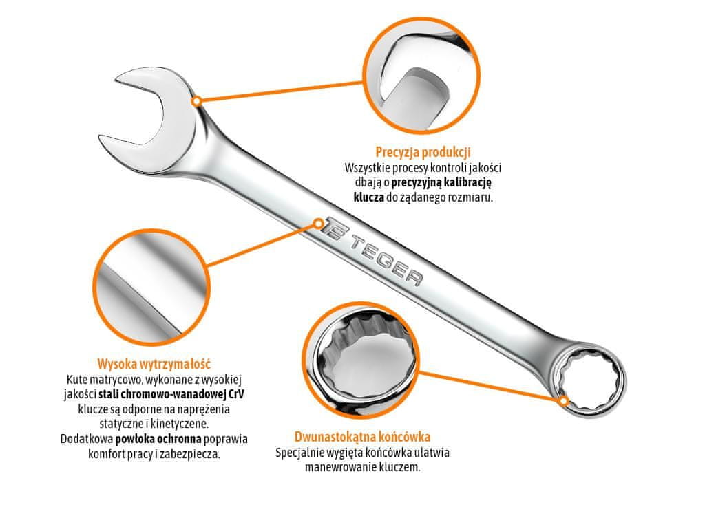 29 mm / TEGER kombinirani ključ iz krom-vanadijeve jeklene zlitine CRV, odporen na statične in kinetične obremenitve. Edinstven površinski premaz bistveno poveča udobje pri delu in omogoča čiščenje orodja. Kovani ključ je popolnoma kalibriran in odporen na deformacije. Dvorezni konec ključa, ki je dodatno nagnjen, olajša manevriranje. Zasnovan za delo tudi v najtežjih pogojih pod velikimi obremenitvami.